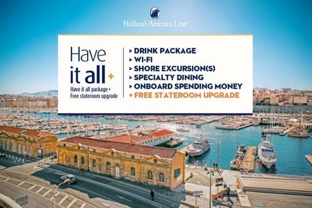Holland America Line actie met onder andere gratis drankjes, hut upgrade, boordtegoed en wifi.
