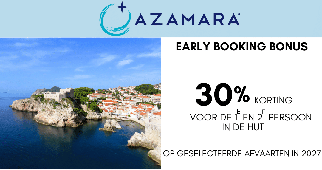 U krijgt nu tot 30% korting op uw cruiseprijs voor de 1e en 2e persoon in de hut. Dit in combinatie met de New Horizon Sale waar u tot $500 boordtegoed per hut ontvangt. Boek daarom uw Azamara cruise nu!