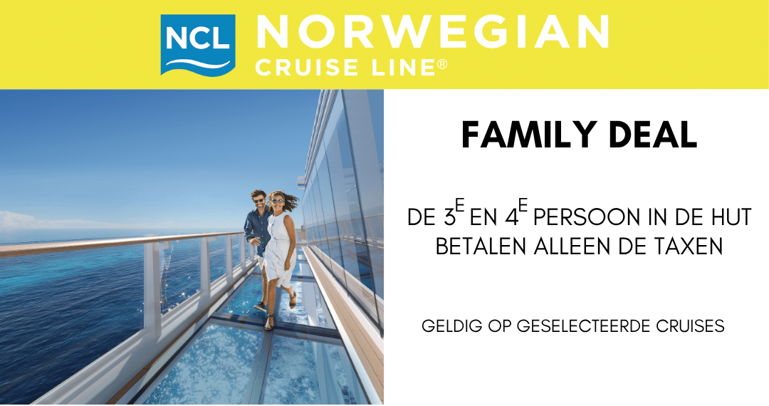 Bij Norwegian Cruise Line reist uw gezelschap extra voordelig mee: de 3e en 4e persoon in de hut betalen alleen de havengelden en taxen.