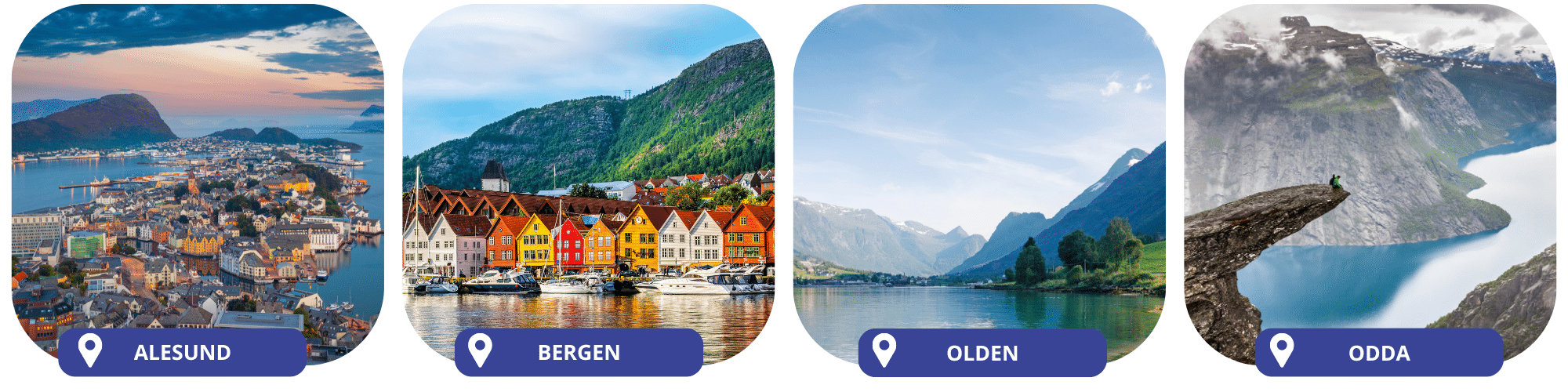 Bezoek Alesund, ontdek het knusse vissersdorp Bergen of geniet van het uitzicht in Olden en Odda.