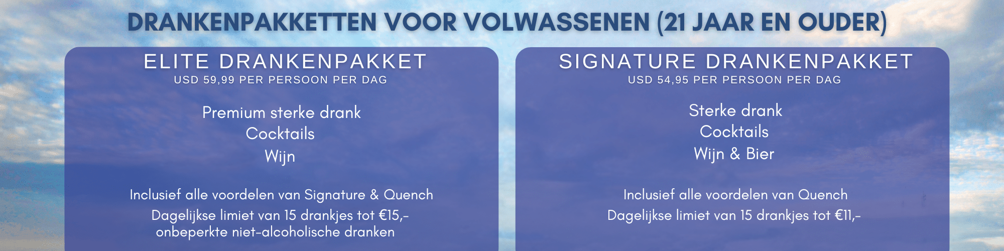 Voor reizigers die het op prijs stellen om een inclusieve vakantie te hebben met extra’s die vooraf in de prijs zijn verwerkt, heeft Holland America Line het ‘HAVE IT ALL’ premiumpakket gelanceerd. In het pakket zijn excursie(s), drankenpakket, diner(s) in specialiteitenrestaurants en Wi-Fi inbegrepen. Dit pakket (niet te verwarren met onze eerdere Have It All promotie) is het gehele jaar door beschikbaar op alle cruises van 6 nachten of langer met uitzondering van onze Grand Voyages.