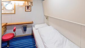 Deze standaard buitenhutten voor maximaal twee personen op het midden- en bovendek hebben aparte slaapplaatsen.