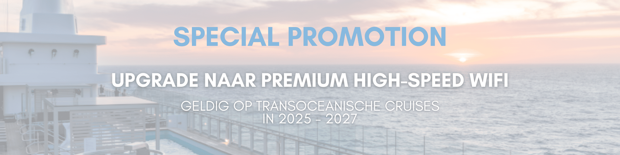 Profiteer van een upgrade naar Premium High-Speed Wifi op geselecteerde Transoceanische cruises in 2025-2027 Zie hieronder de geselecteerde afvaarten.